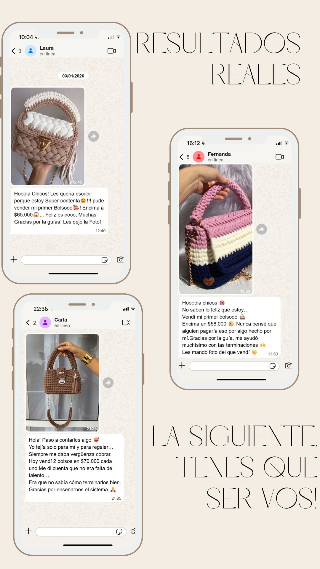 Yo amaba tejer, pero mis bolsos me quedaban desparejos y sin terminación prolija. Con BOLSOS DE LUJO entendí tensión, aumentos y terminaciones boutique. Los videos me re funcionaron, están súper claros y te llevan paso a paso. Hice este modelo y me cayeron encargos: 4 pedidos en 1 semana.